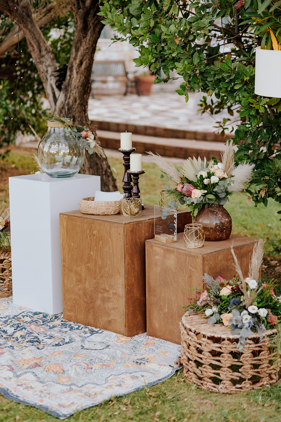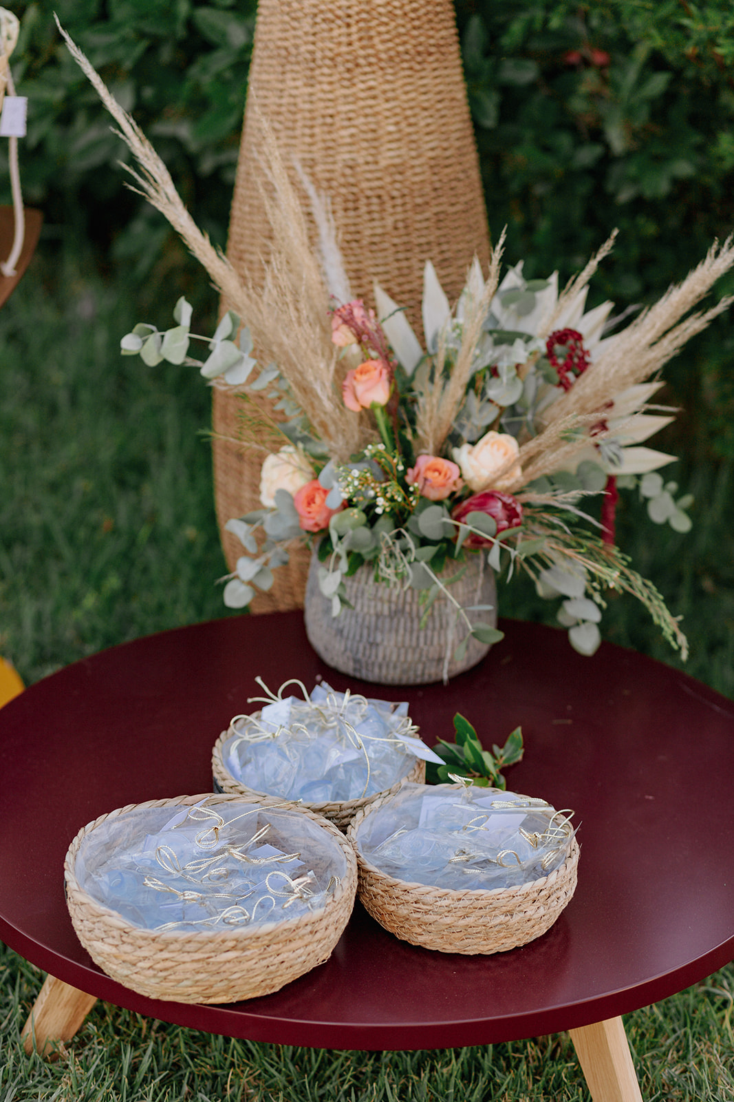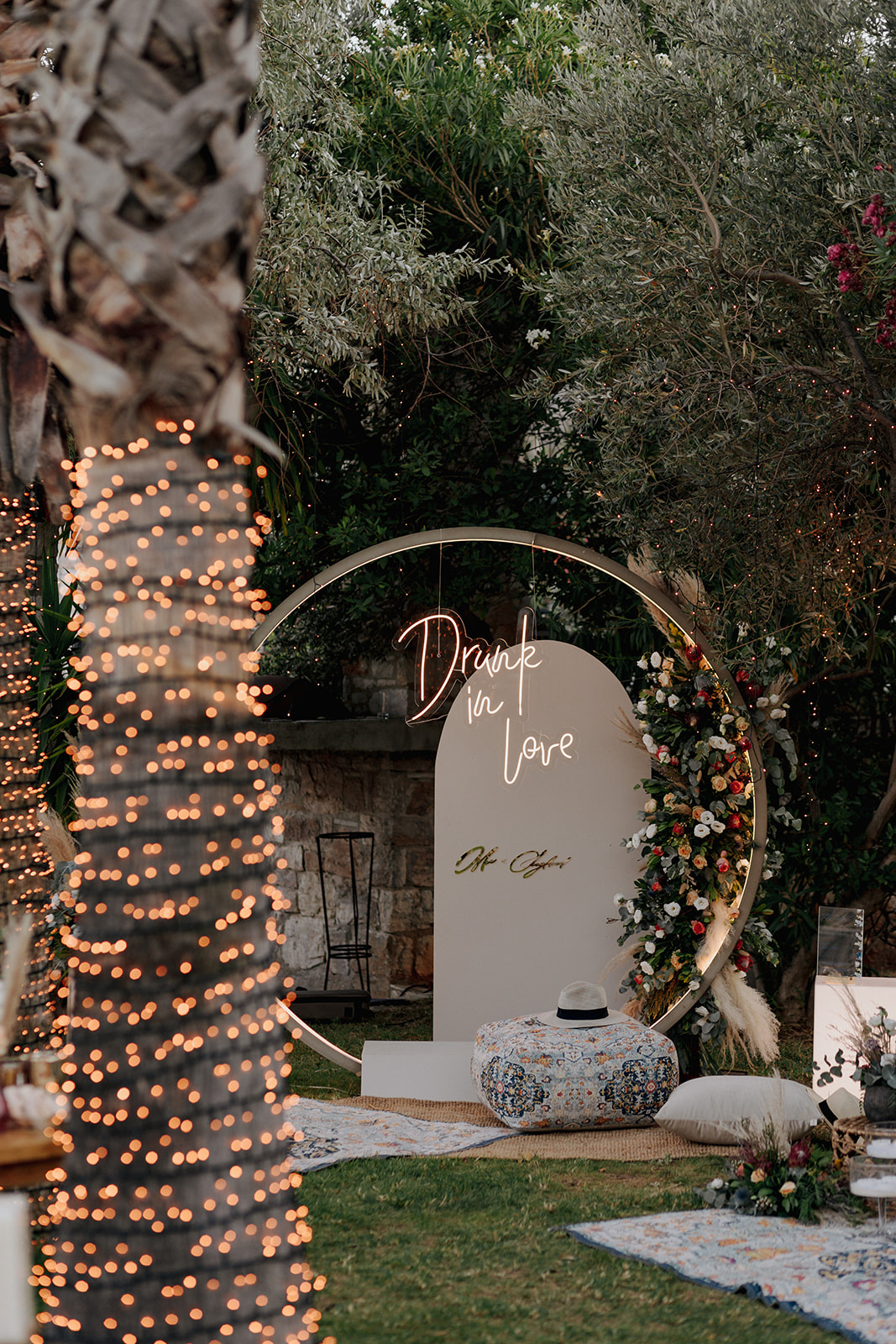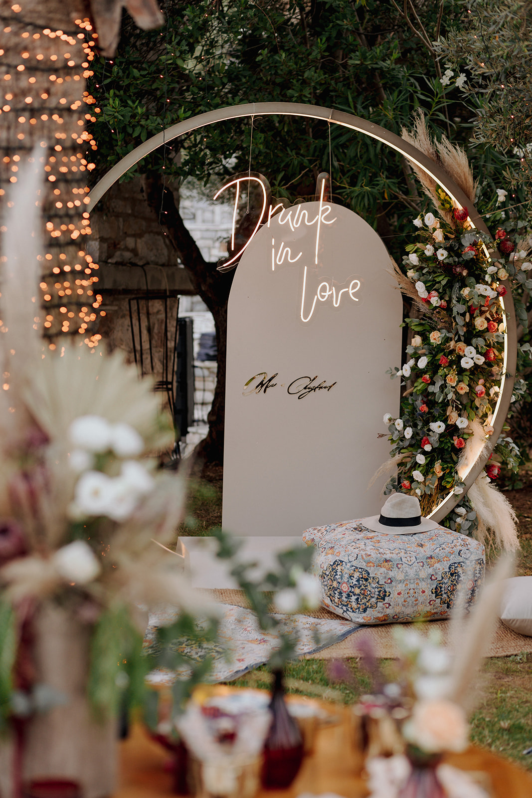 Ρομαντικά, απαλά και εκλεπτυσμένα χρώματα, λουλούδια σε ρομαντικές συνθέσεις, fairy lights, boho chic & elegant στυλ προκύπτει από τις λεπτομέρειες του στολισμού